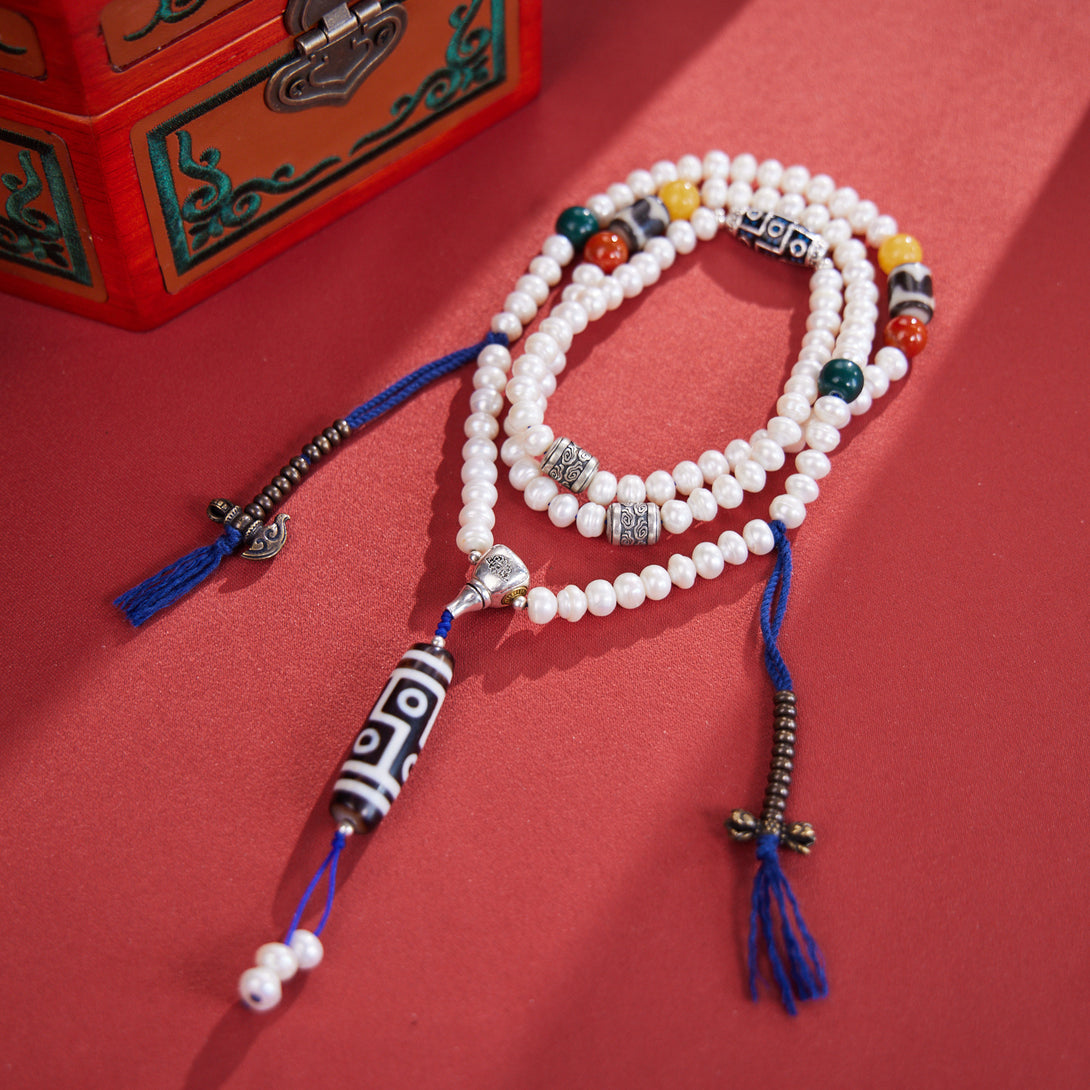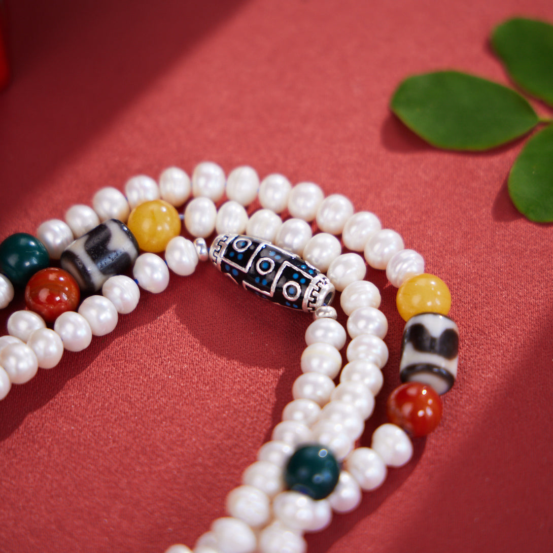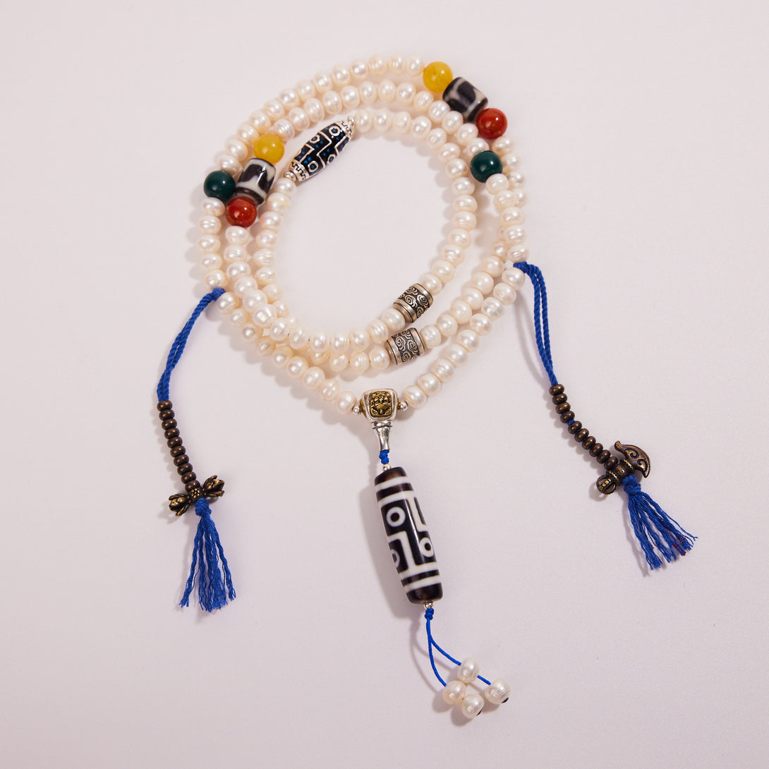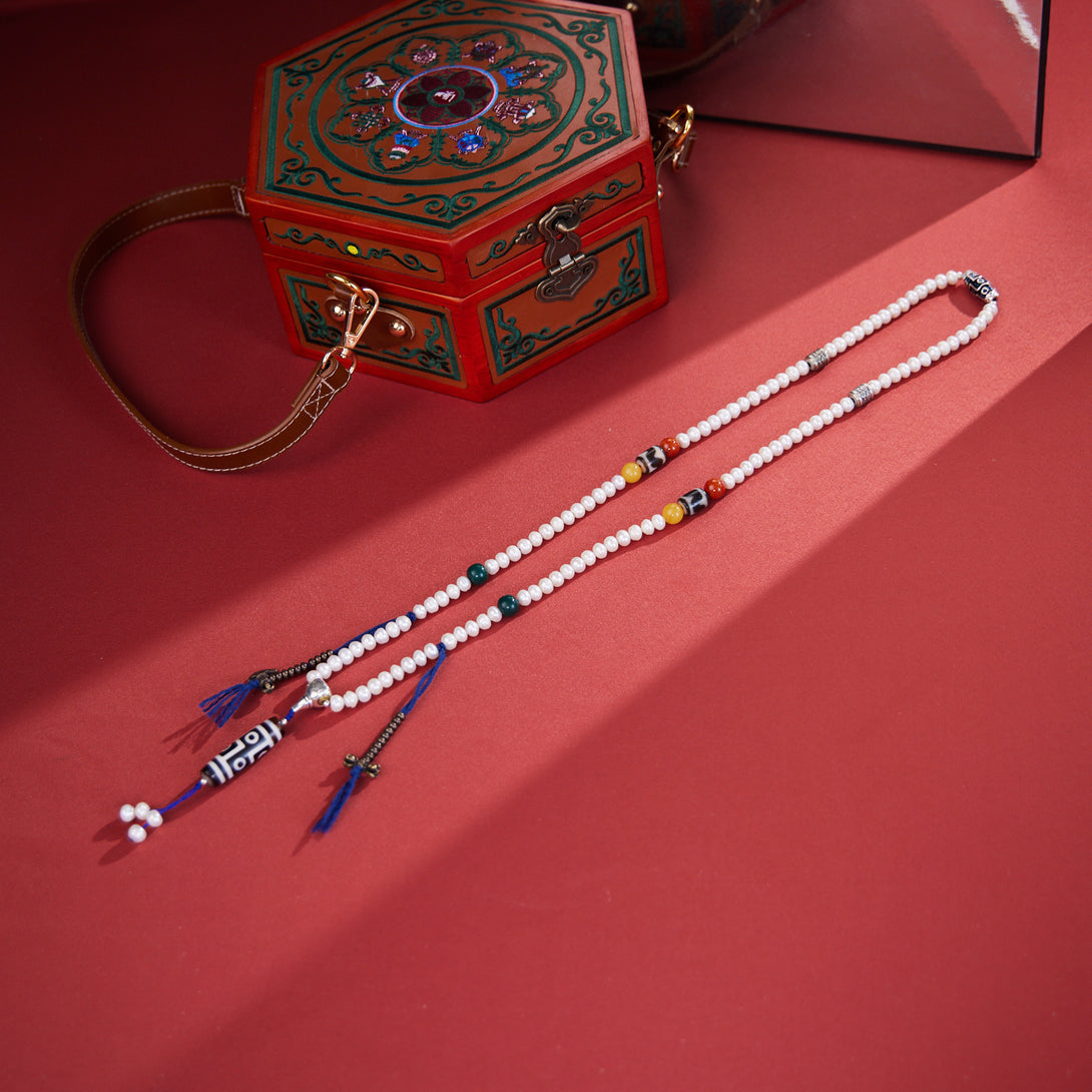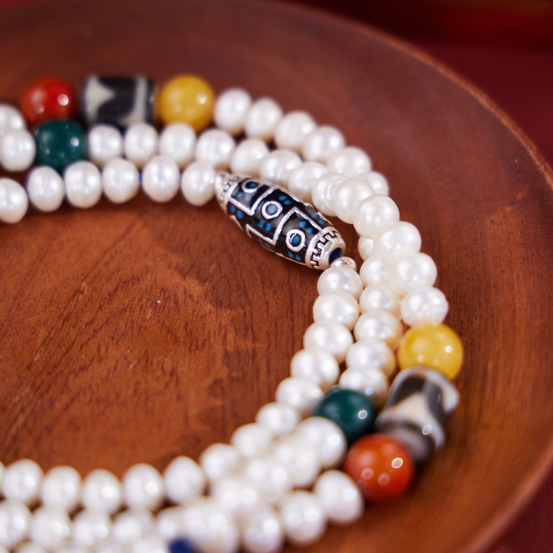 Dzi Bead and Pearl Elegance Tibetan Necklace
