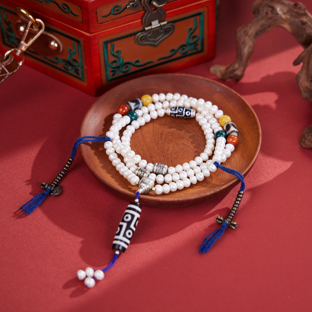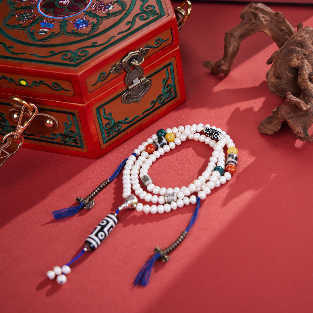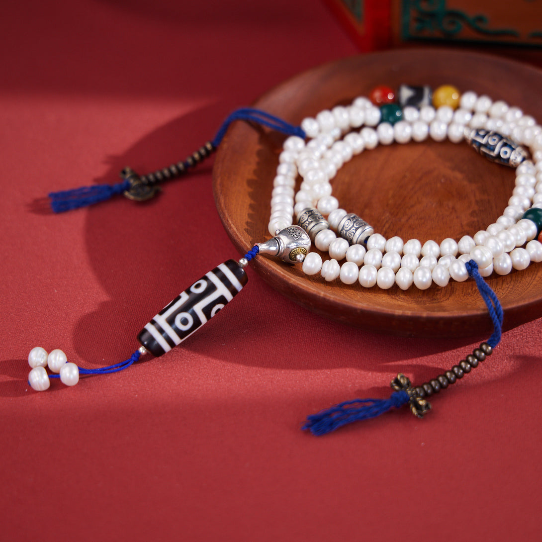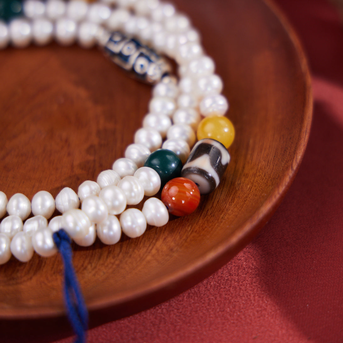 Dzi Bead and Pearl Elegance Tibetan Necklace