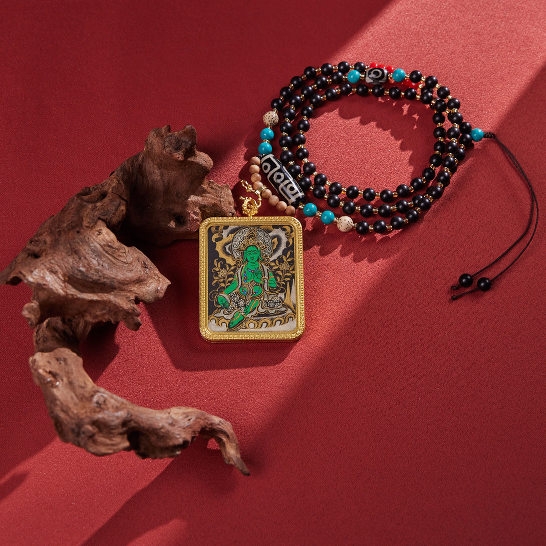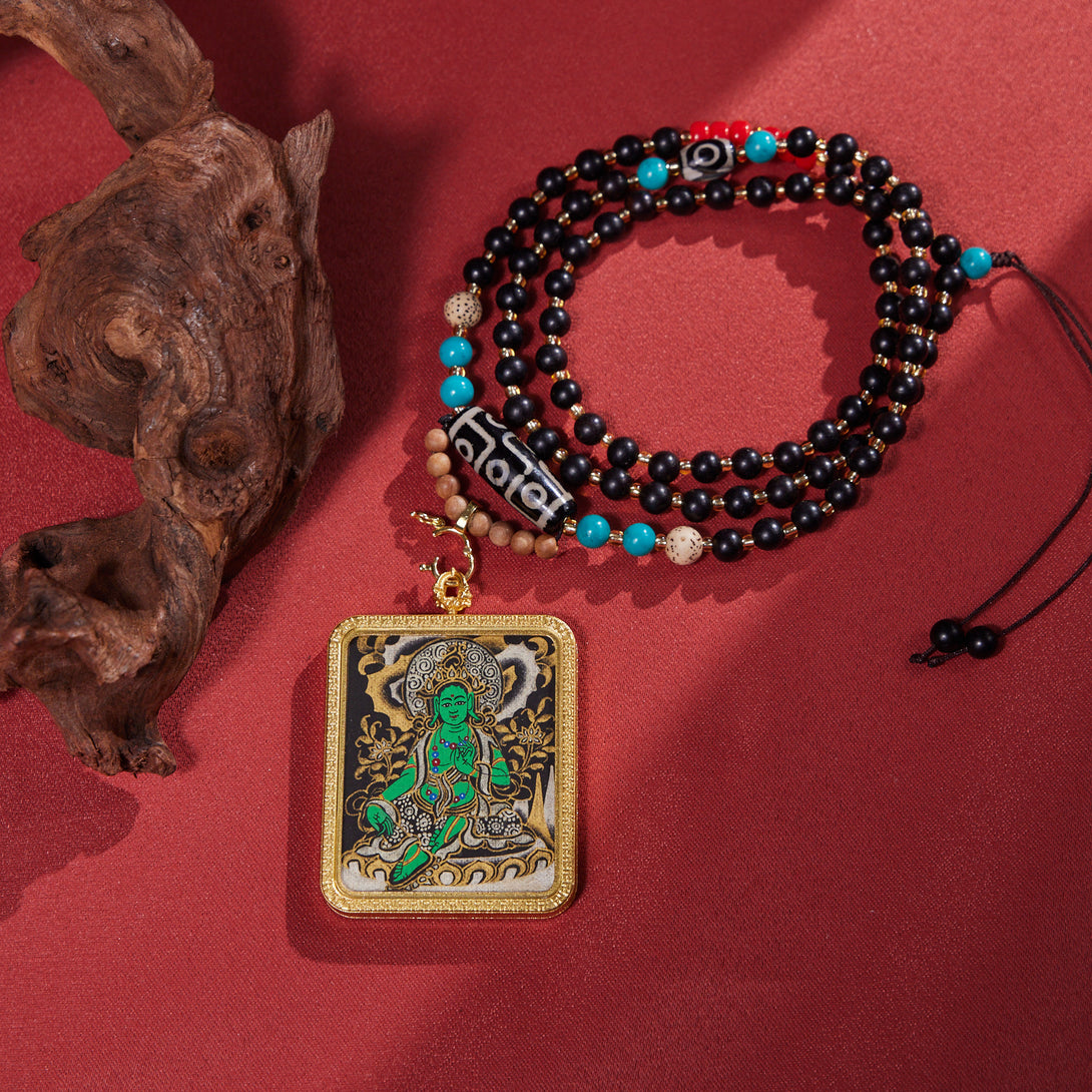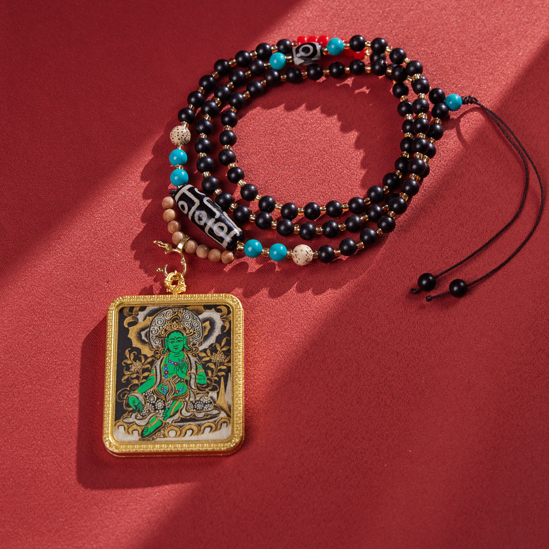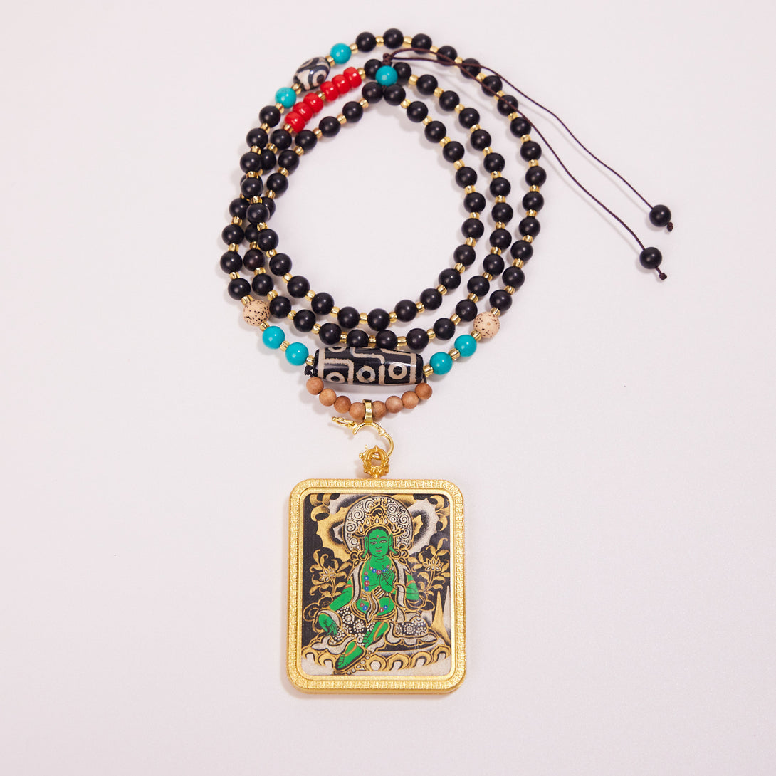 Green Tara with Dzi & Malachite Beads Thangka Pendant Necklace