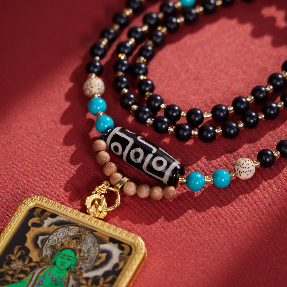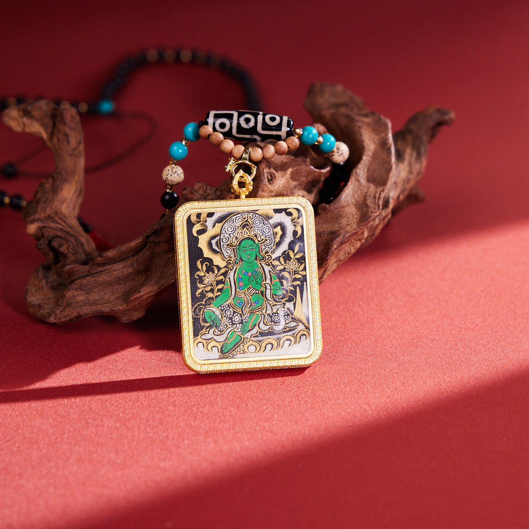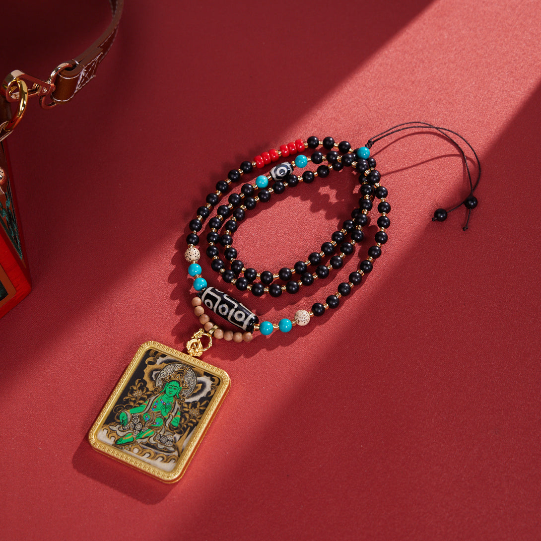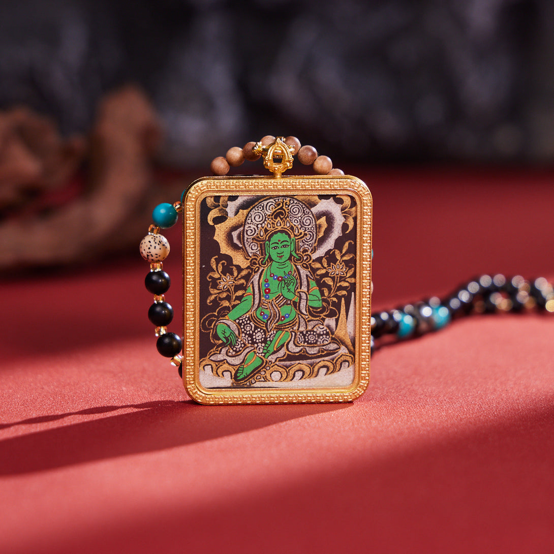 Green Tara with Dzi & Malachite Beads Thangka Pendant Necklace