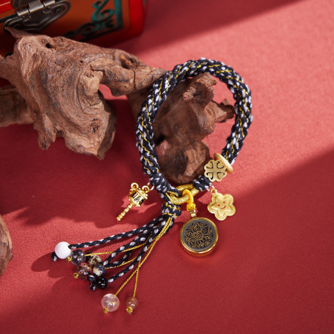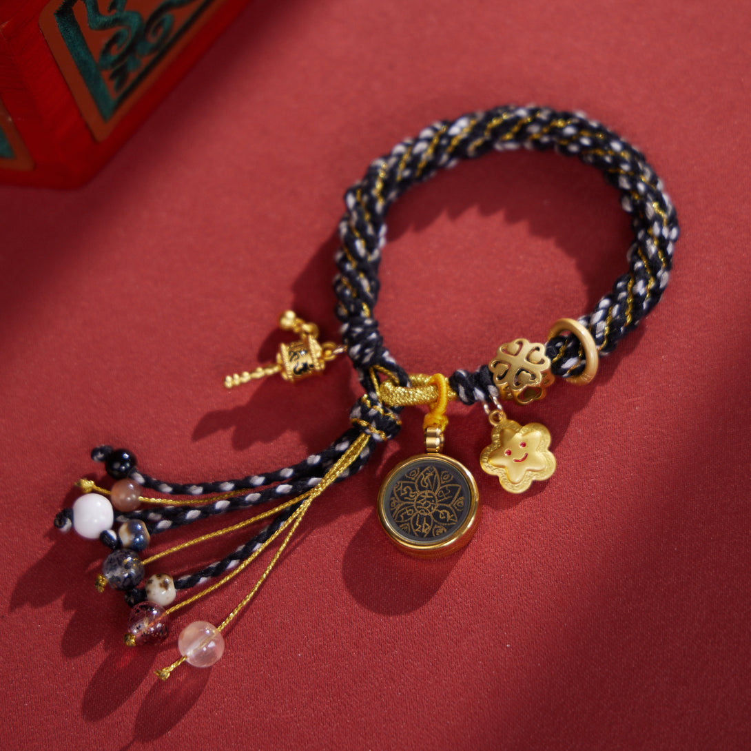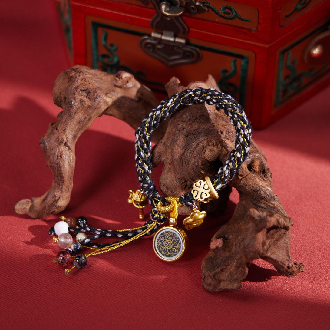 Six-Syllable Mantra with Black, White & Gold Braided Cord Thangka Bracelet