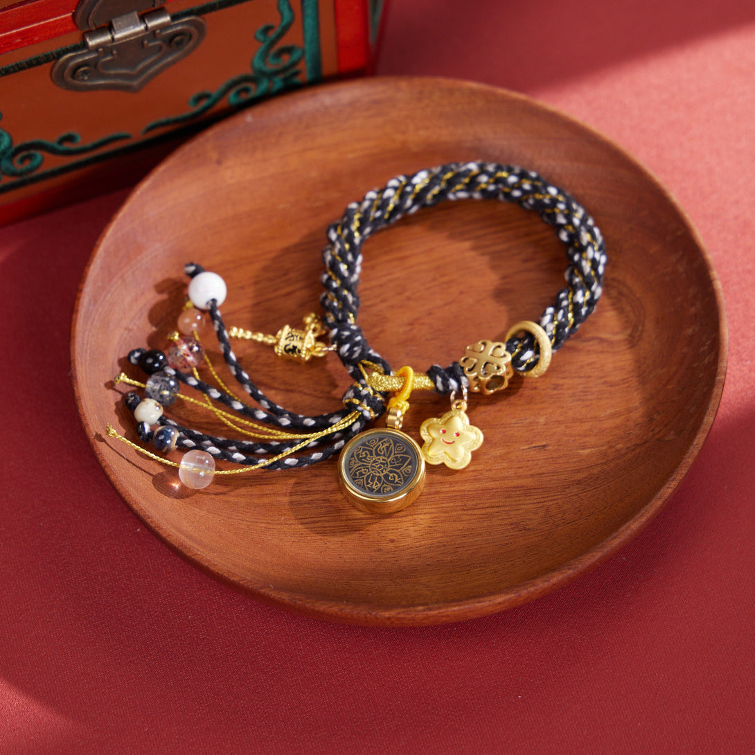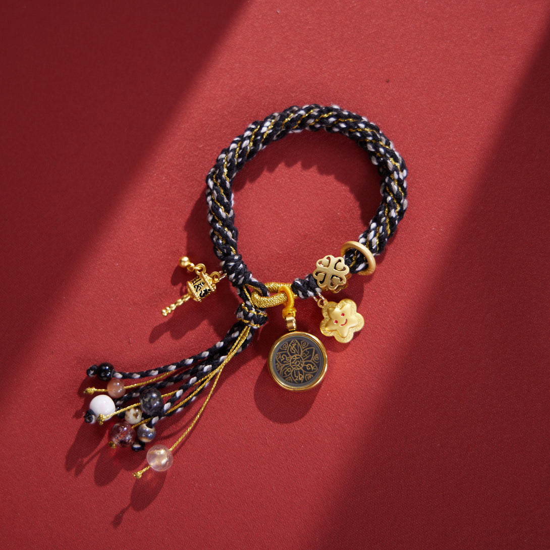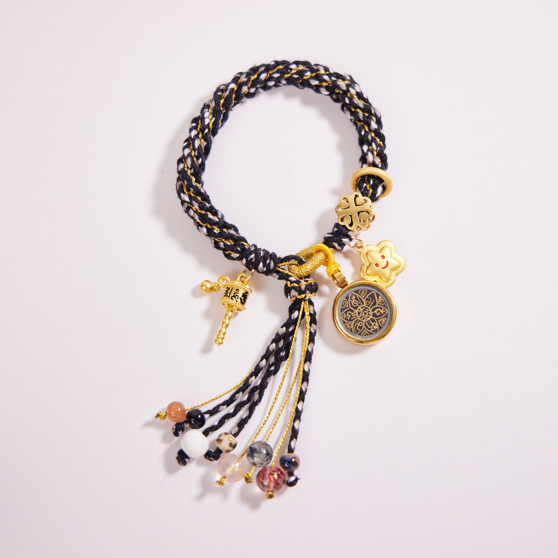 Six-Syllable Mantra with Black, White & Gold Braided Cord Thangka Bracelet