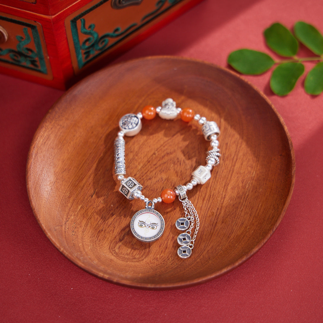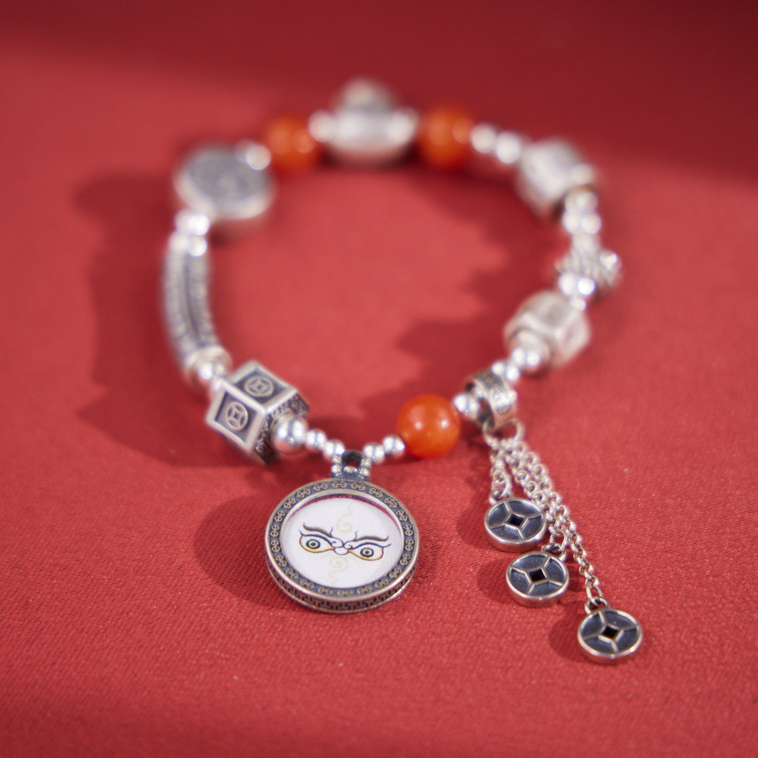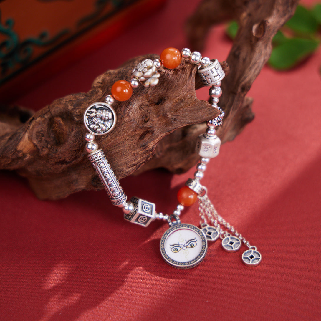 White Jambhala Eyes with Silver and Nanhong Agate Thangka Bracelet