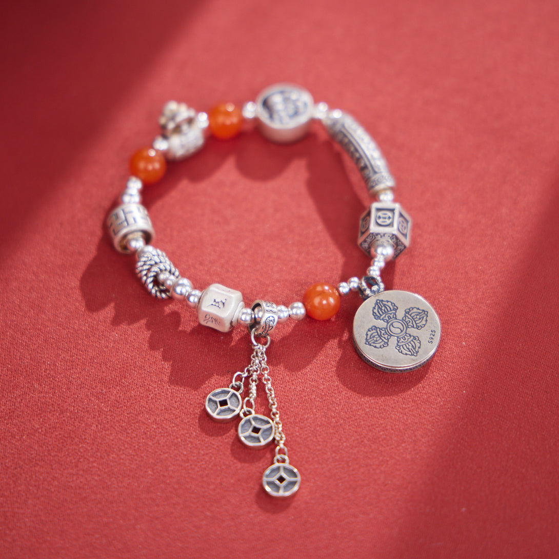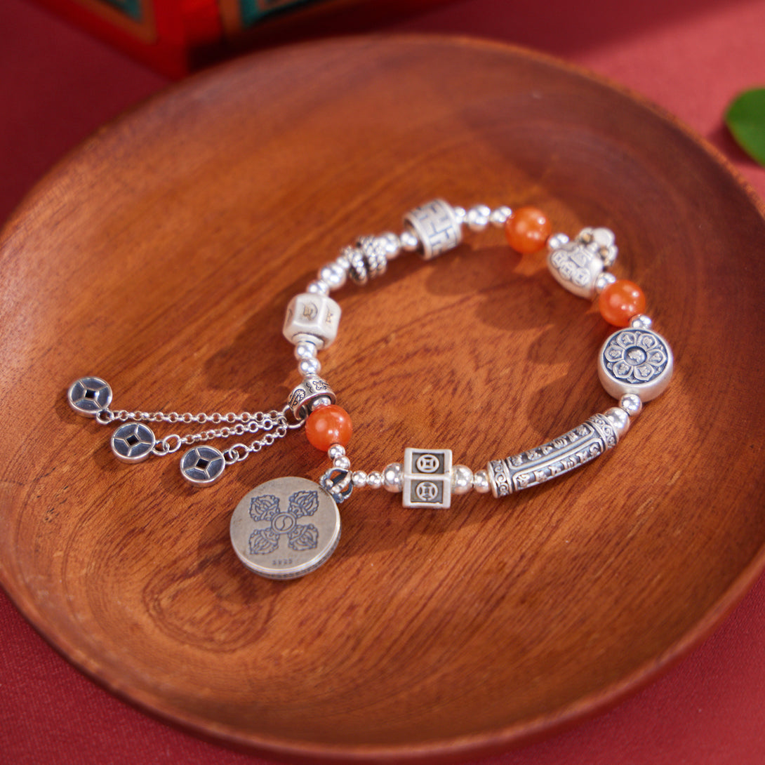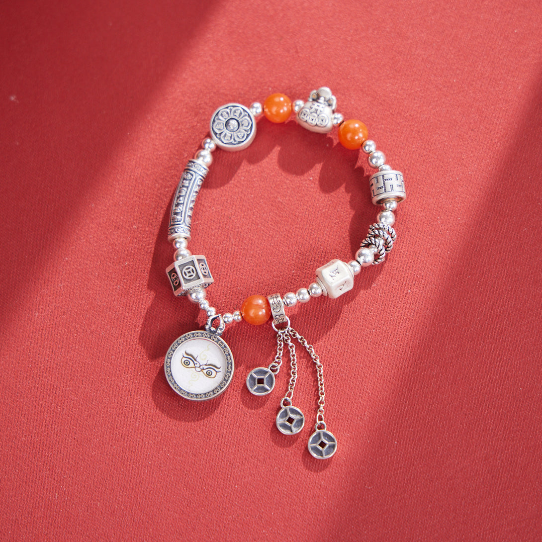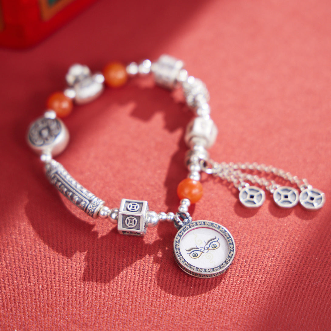 White Jambhala Eyes with Silver and Nanhong Agate Thangka Bracelet