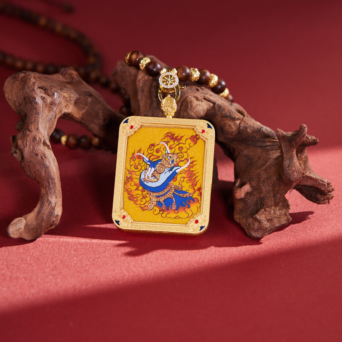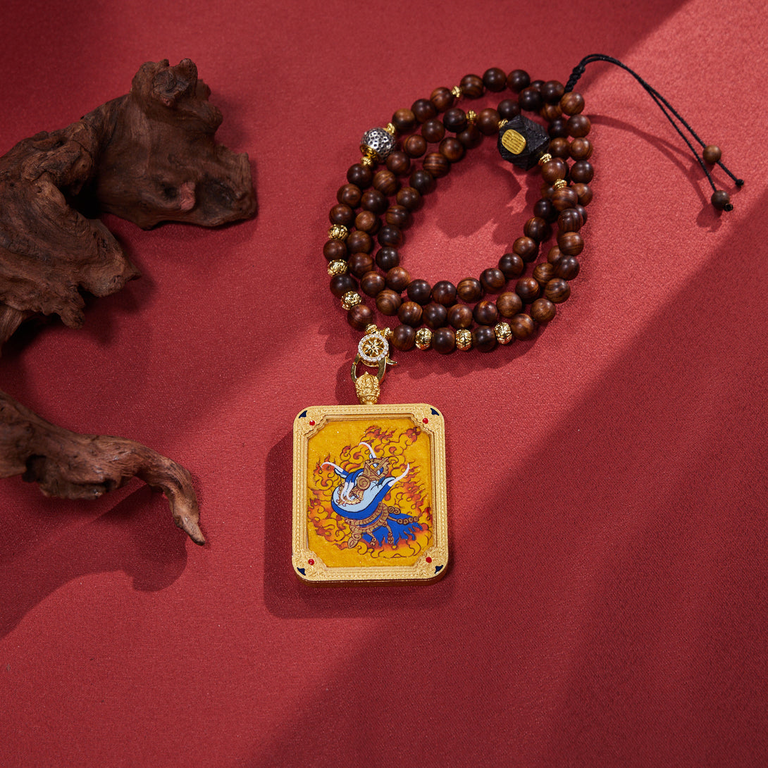 The chain is consecrated to Yellow Jambhala (Sanskrit: Jambhala; Tibetan: Jambhala), a wrathful deity in Vajrayana Buddhism who embodies the energetic manifestation of Amitabha Buddha’s compassion. Regarded as the lord of earthly riches and spiritual abundance, Jambhala crushes poverty with his mongoose (which spews jewels) and holds a wish-fulfilling gem in his left hand, symbolizing the union of material prosperity and dharma wisdom.